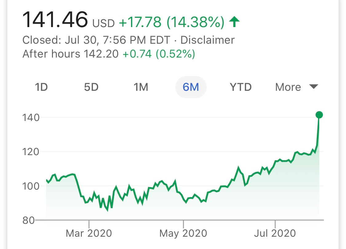 📈Short-term Performance: The company I will first call out here in illustrating short-term performance is UPS. It’s a boring industrial company, right? Well, this company, and its peers, remain quite important in 2020. When UPS reported earnings last month, the market had a strong reaction. I took a screen shot on that evening:
